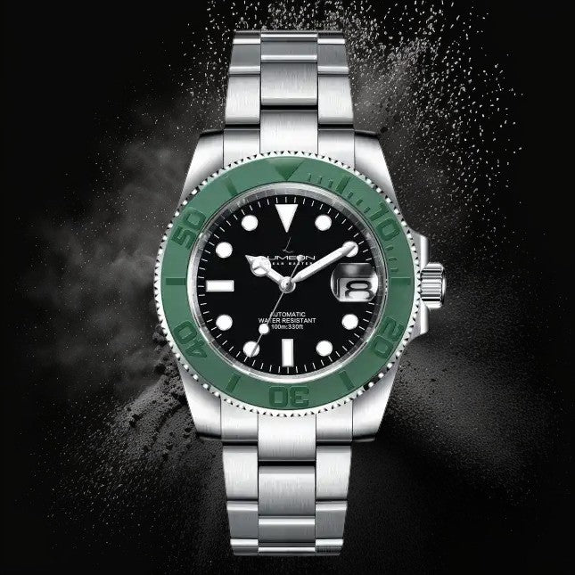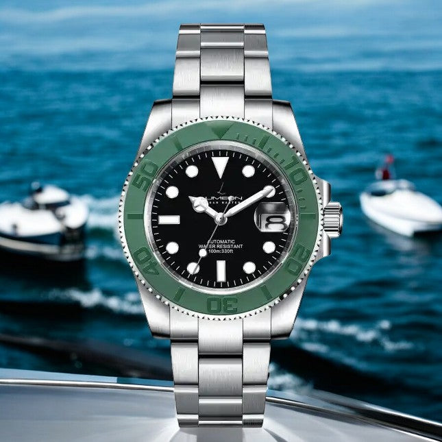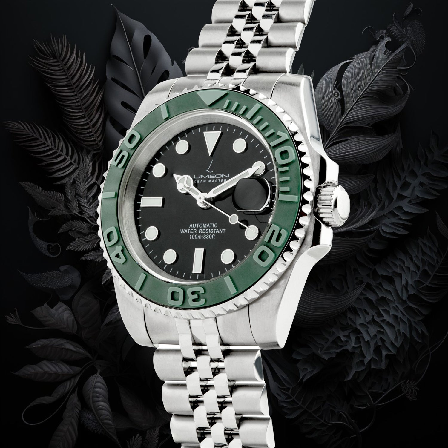 The Ocean Master boasts an iconic design, housed in a solid and sophisticated 40mm 316L stainless steel case. This case not only provides durability but also offers a timeless elegance that stands out in any setting. The case is enhanced by a striking green matte ceramic bezel, which adds a modern touch while ensuring scratch resistance and long-lasting beauty.